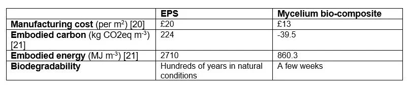 Table 2 – A comparison of EPS and mycelium bio-composite production. Cost, embodied energy, embodied carbon and biodegradability are compared.