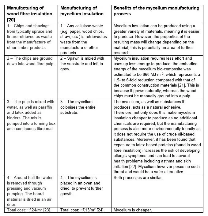 Table 1 – A comparison of manufacturing wood fibre and mycelium insulation. Benefits of mycelium manufacturing are highlighted.